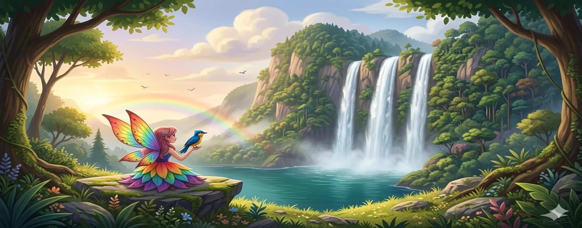 "Peri Lulu, yang aku dengar penyihir itu, berada di balik bukit yang ditandai dengan air terjun kembar tiga dan aku rasa kita sudah dekat," kata Kiko, mengangkat kepala dan menatap ke arah bukit yang tinggi di depan mereka. "Penyihir itu pasti berada di balik bukit itu."Peri Lulu mengikuti pandangan Kiko dan melihat ke arah bukit yang ditutupi hutan lebat dan air terjun kembar tiga. Dia tidak bisa menahan kegembiraannya, matanya berbinar-binar ketika melihat keindahan air terjun itu."Wah, Kiko! Aku lihat air terjun kembar tiga itu! Aku yakin penyihir itu pasti ada di sana!" seru Peri Lulu, dengan gembira.