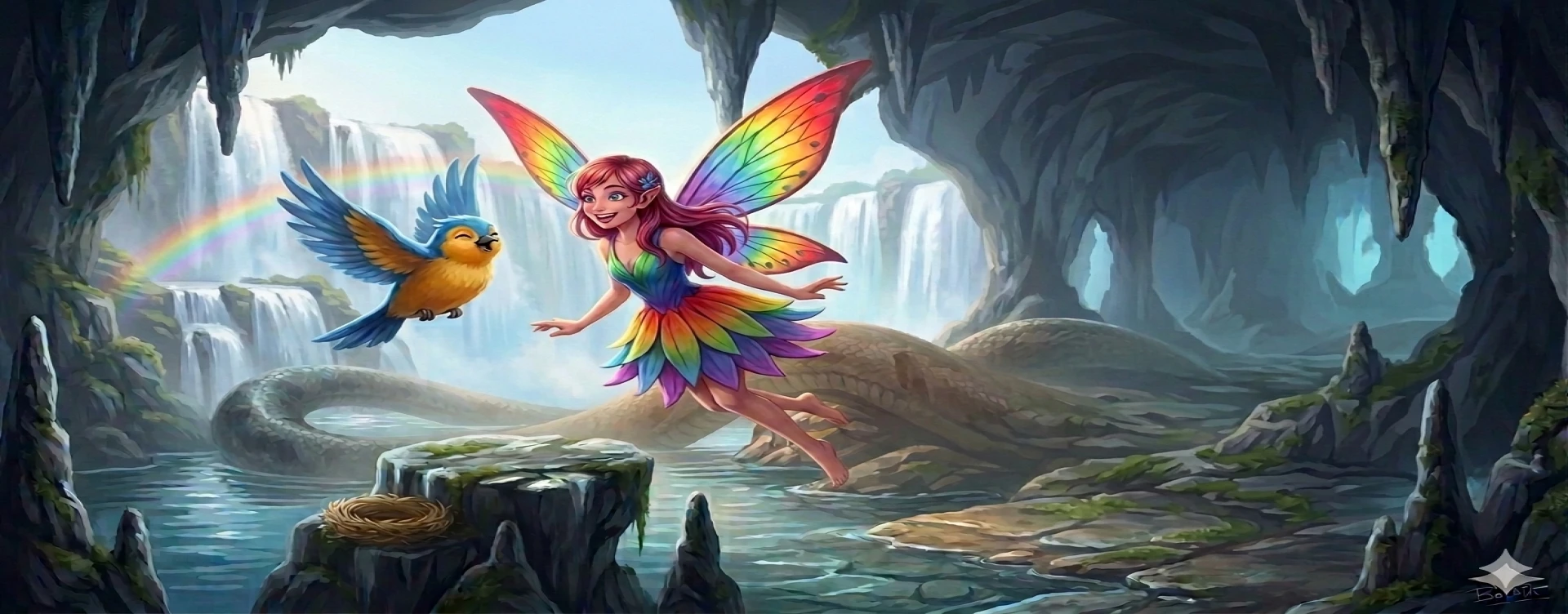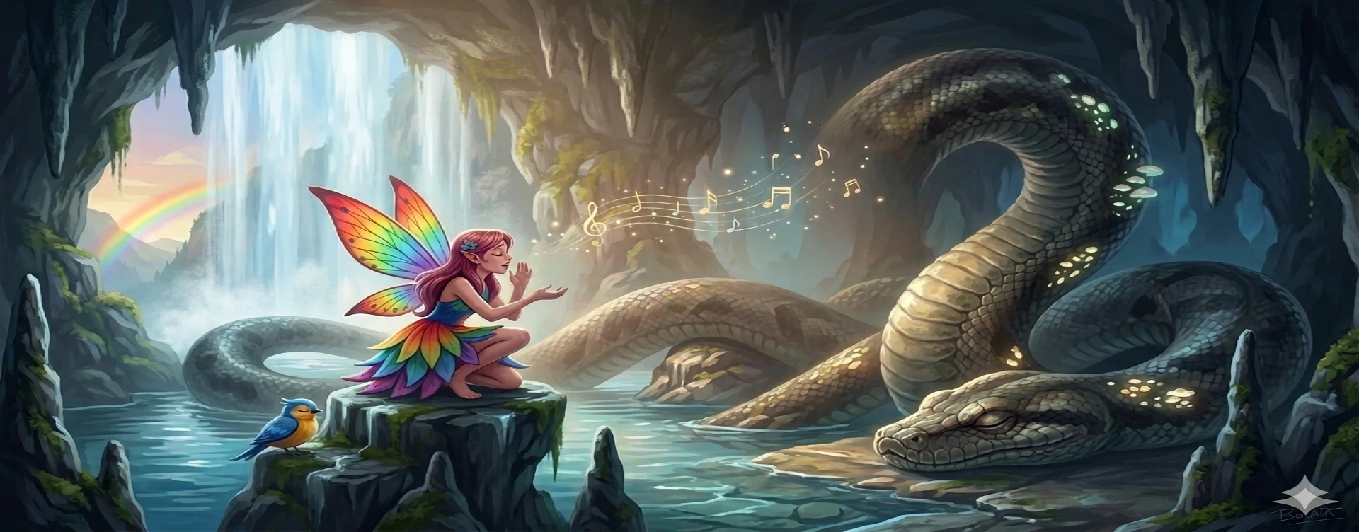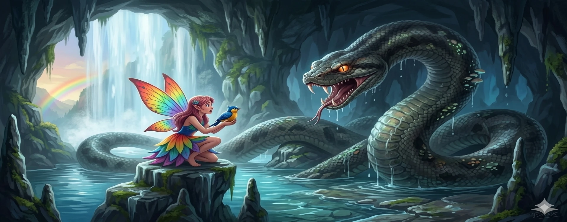 Peri Lulu maju ke depan, dengan senyum yang manis. "Kami tidak ingin mengganggu, kami hanya ingin melewati air terjun ini untuk mencapai bukit sebelah." Ular itu menatap mereka sejenak, lalu menyeringai, "Sayangnya ini bukan air terjun yang dapat kalian lalui, ini adalah rumahku, dan kalian mengacaukan mimpi indah ku". Peri Lulupun menunduk, "Kalau begitu maafkan kami, kami akan menuju ke air terjun berikutnya, aku akan mencoba menidurkan mu dengan laguku". "Baiklah, aku akan membiarkan kalian pergi, tapi kalian harus menyanyikan lagu tidur untukku. Aku ingin tidur kembali." Peri Lulu mengangguk, dan mulai menyanyikan lagu tidur yang merdu. Suara nyanyiannya seperti suling yang menenangkan, dan ular itu mulai menutup matanya, tertidur kembali.