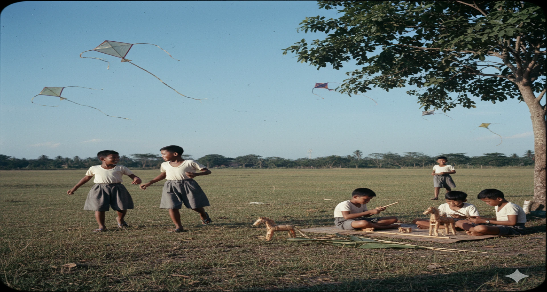 Aku melihat seorang anak kecil yang sedang berjalan ke sekolah dengan membawa buku dan pensil seadanya. Aku melihat bagaimana gurunya menulis dengan kapur di papan tulis yang sudah aus di sebuah sekolah yang masih memakai atap rumbia. Dia dan kawannya memakai baju kemeja seadanya, celana pendek diatas lutut dan sendal jepit penuh debu. Aku merasa terharu melihat betapa sulitnya hidup pada masa itu. Tapi, aku juga melihat bagaimana anak-anak itu tetap bersemangat dan gembira. Setelah pulang sekolah, mereka bermain bersama, tertawa, dan berlari-lari di lapangan, beberapa dari mereka bermain kelereng dengan temannya, sementara yang lain sedang bermain layang-layang di langit yang cerah. Aku mengenali salah satu dari mereka, yaitu anak kecil yang aku lihat sebelumnya yang sedang berjalan ke sekolah.