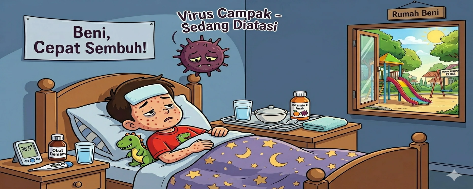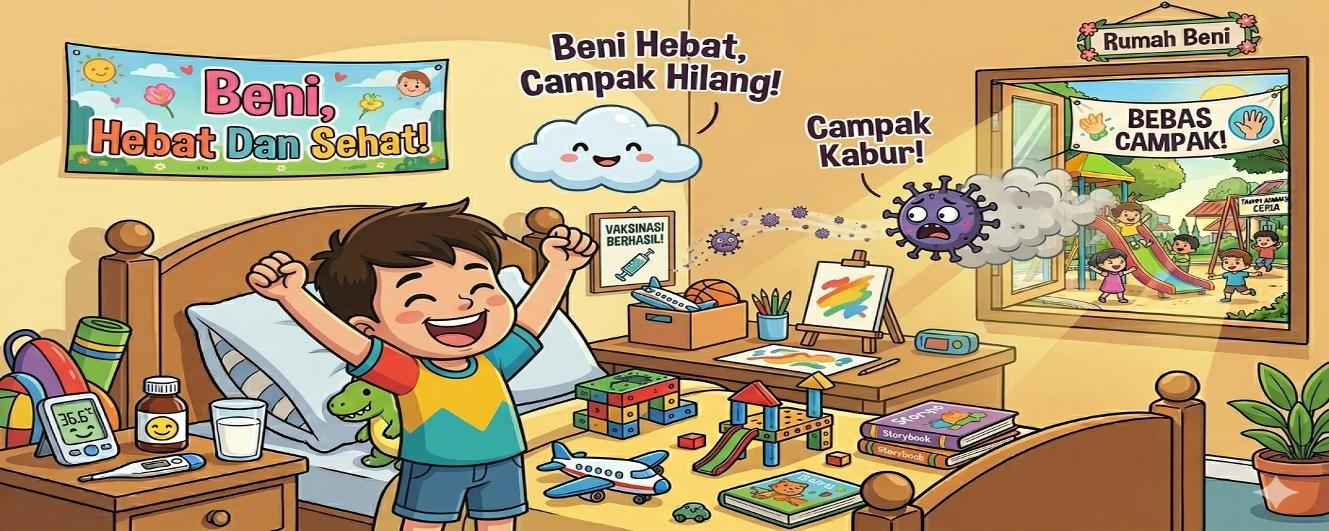 Ini yang paling kuat. Suntik vaksin Campak waktu bayi 9 bulan, terus diulang umur 18 bulan dan sampai umur 59 bulan. Kayak dikasih tameng sama dokter biar virus campak mental kalau nyerang.