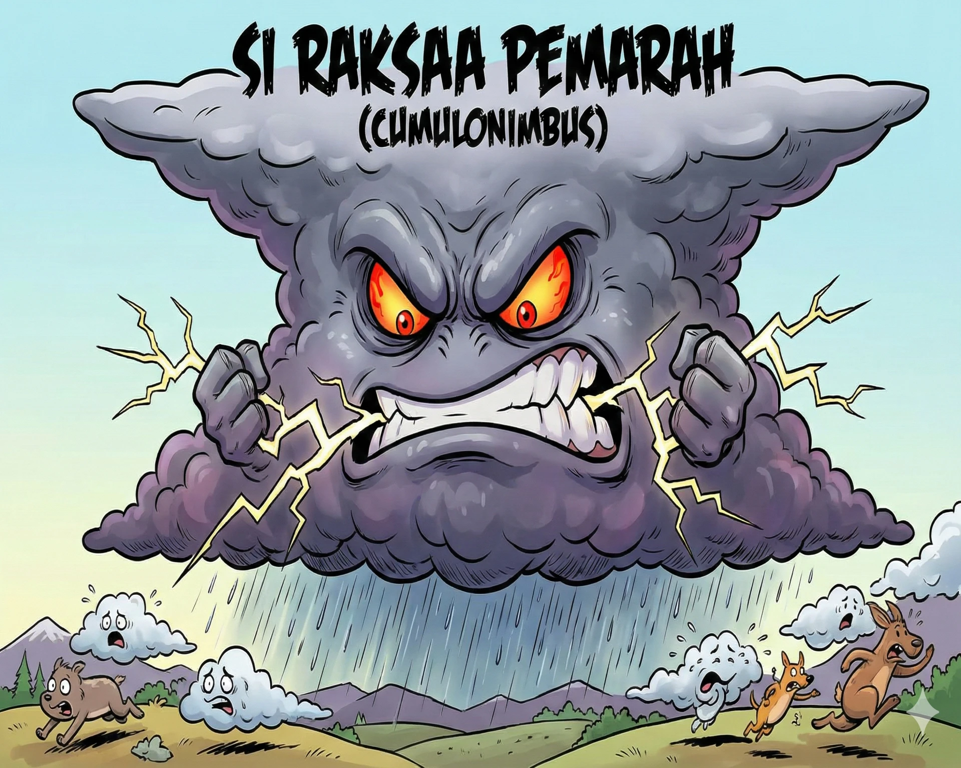 - Artinya: Awas! Si Raksasa ini membawa hujan deras, angin kencang, dan petir (geledek) ⚡. Kalau melihat awan ini, segera masuk ke dalam rumah ya!
